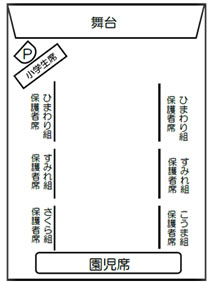 | 保護者 参加人数 | ・こうま組・年少組・年中組・・・各家庭保護者2名 ※名札①②を必ず付けてください。 ・年長組・・・・・・・・・・・・・・・・・・・・・各家庭保護者3名 ※名札①②を必ず付けてください。ご家族でまとまってお座りください。 ・中学生以上は保護者の人数になります。保護者席で見てください。 ・小学6年生までのお子さんは卒園児席か、保護者席の赤いリボンのついた椅子をご利用ください。保護者席(赤いリボンのついていない椅子)に座る場合は保護者としての人数になります。 ・未就園児さんは人数に入りません。保護者の方のそばで見てください。 ※未就園児さん・小学6年生までの卒園児さんは保護者用名札は不要です。 ※9ページの参加表を10月3日(金)までに提出してください。 | |